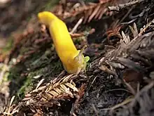 Banana slugs are detritivores, or decomposers. They process leaves, animal droppings, moss, and dead plant material, and then recycle them into soil humus.[15][16] They are generalist feeders, though they exhibit a preference for mushrooms.[17] Through their consumption of various plant matter and animal excretion, banana slugs acts as agents of seed dispersal, in turn effecting seed survival, deposition, and germination rates.[18] They spread seeds and spores when they eat, and excrete a nitrogen-rich fertilizer.[19] Additionally, by consuming detritus (dead organic matter) slugs contribute to decomposition and the nutrient cycles[20] and are an important aspect of the ecosystem.