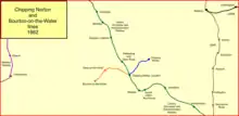 The Kings Sutton to Chipping Norton local passenger service was withdrawn in 1951, and in October 1962 the Kingham to Cheltenham service was also closed. This was followed by closure of the Kingham to Chipping Norton trains in December 1962, as well as the Kingham to Hook Norton freight service. Hook Norton to Adderbury closed in 1963. Kingham to Chipping Norton and Kingham to Bourton-on-the-Water closed completely in September 1964. Ironstone workings at Adderbury serviced from Kings Sutton enabled the easternmost stub to continue until 1969.[6]
