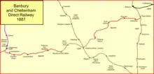 The Banbury and Cheltenham Direct Railway received royal assent on 21 July 1873.[2][4] There was to be a triangular junction at each end, Kings Sutton and at Hatherley, near Cheltenham.[note 3] At Chipping Norton Junction, later Kingham, there was to be a flyover across the main line for the benefit of through trains. An alternative proposal was considered, to make a loop entering from Chipping Norton in to the junction from the south, enabling through operation without the cost of a bridge, but this was not proceeded with.[2]