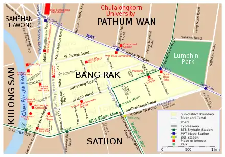 Bang Rak (Thai: บางรัก, pronounced [bāːŋ rák]) is one of the fifty districts (khet) of Bangkok, Thailand. It lies on the eastern bank of the Chao Phraya River, beyond Khlong Phadung Krung Kasem, which marked the old city boundary. Originating from riverside settlements dating from before the city's foundation, Bang Rak grew inland as new roads and canals were constructed through the area during the second half of the nineteenth century and the early twentieth, attracting communities of expatriates and developing into a major commercial district. Bangkok's rapid economic growth in the late twentieth century saw the areas along Si Lom and Sathon roads transformed into one of the city's main business districts, teeming with skyscrapers. The district, officially recognised at least since 1908, covers an area of 5.54 square kilometres (2.14 sq mi), and has a registered population of 48,227 (as of 2019). Today, Bang Rak is known for the financial activity of its commercial offices, as well as its vibrant nightlife scenes. Diverse historic and religious sites, most significantly concentrated in Bang Rak Subdistrict on the waterfront, reflect the district's multicultural history.
