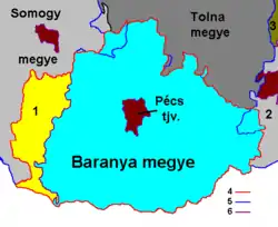 The formation of modern Baranya County. (1) Territory assigned from Somogy County to Baranya County in 1950.