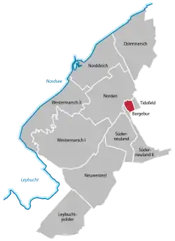 Bargebur is an urban quarter in the east of the borough of Norden, northwestern Germany, and has a population of around 500 (as at 12/2016),[1] who inhabit an area of just 0.65 km².[2] The houses of Bargebur have been entirely absorbed within the built-up area of Norden. In the south of the quarter, separated by the B72, which acts as a ring road around Norden here, is the Tidofelder Holz, a forest in the neighbouring municipality of Lütetsburg. Along the Fehn Canal runs the so-called Verschönerungsweg. On old maps Bargebur is also called Bergum or Westekelbur.