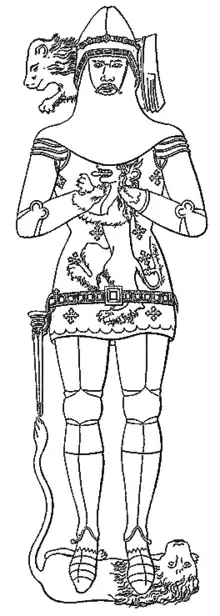 Funerary monument to Thomas de Braose, 3rd Baron Braose (1352–1395) (Baron of the 2nd creation), dressed in full armour, his head resting on a helm. The tomb chest is decorated with quatrefoils and heraldic escutcheons showing the lion rampant Braose arms impaling the arms of various heiresses. South wall of sanctuary, St Mary's Church, Horsham, West Sussex.[1] Drawing by Samuel Hieronymus Grimm, 1781.