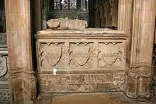 He was succeeded by his eldest son by Eve de Boltby, William de Cantilupe, 2nd Baron Cantilupe (1293-c.1321), who was involved in the murder of Piers Gaveston, favourite of King Edward II. In 1313, William begged king Edward on bended knee for forgiveness, after which he relinquished his estates to his younger brother, Nicholas. William died at the age of 28, unmarried. His younger brother Nicholas succeeded him as the 3rd Baron Cantilupe (c.1301-1355). In 1343, Nicholas founded Beauvale Priory[16] within his deer park at Greasley, with the consent of his distant cousin William La Zouche, Archbishop of York (one of the two co-heirs of the de Cantilupe senior line was a member of the Zouche family, descended from one of Archbishop William's two sisters) on the death of George de Cantilupe (1251-1273), 4th feudal baron of Eaton Bray, Lord of Abergavenny. Amongst the many Cantilupe manors they inherited was Harringworth which they made their seat. (See Baron Zouche "of Haryngworth")). He served as Governor of Berwick from 1335. He was buried in Lincoln Cathedral, where his severely mutilated recumbent effigy still survives atop a chest tomb displaying the arms of Cantilupe of Greasley. He disinherited his son[17] (by his first wife "Tiphane") William de Cantilupe, 4th Baron Cantilupe (1325-c.1375), last in the male line who was predeceased by his two sons, Nicholas de Cantilupe (1342-1371) of Greasley, eldest son and heir of his grandfather, slain at Avignon[18] petitioning the pope to reverse the annulment of his marriage obtained by his wife (Katherine Paynel), supposedly on the grounds of impotence.[19] He died without issue, his younger brother William de Cantilupe (1344-1375) becoming his heir, but he was murdered by his cook and squire, possibly at the behest of his wife Maud Neville. The murder became a much-celebrated criminal lawsuit,[20] see Murder of William de Cantilupe.[21]