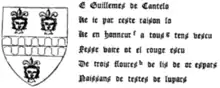 - ↑ The oft-quoted translation of the Latinized form as "from the song of the wolf" would be de cantu lupi and "from the singing wolf" would be de cantanti lupo, of which de canti lupo might be an abbreviation. However it appears from the early pre-heraldic seals of the family that some play was made on the Latin noun Lupus, "wolf" (see M Julian-Jones, Thesis on de Cantilupe and Corbet families, 2015, Online Research @Cardiff (ORCA), Cardiff University )
