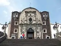 Temple located near the eastern slope of the Tepeyac hill. It was built from 1777 to 1791 and designed by the architect Francisco Guerrero y Torres.[9] It was built on a well of water considered miraculous, so pilgrimages to the place soon began. A large number of sick people drank and washed their wounds on the same site, so it soon became a focus of infections. To control the epidemics, direct access to the well was prevented and a simple roof was built, but the pilgrimages continued. By 1777 the decision was made to build a temple on the site.