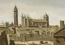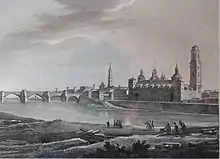 Numerous churches have been built upon this site through the years. The tiny chapel built by Saint James later gave way to a basilica-like enclosure during Constantine I's time; subsequently being transformed into Romanesque, then Gothic then Mudéjar styles.[8] The venerated shrines at Zaragoza date to the Christian Reconquest by King Alfonso I in 1118.[9] A church in the Romanesque style was built under the pontificate of Pedro de Librana[8] who is also credited with the oldest written testimonial to the Virgin at Zaragoza.[6] A tympanum on the south wall of this Romanesque church still stands.[8]