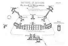 The Batterie de Bouviers was part of an ensemble comprising two forts, the Fort de Villeras in Saclay and the Fort du Haut-Buc, with five peripheral works: the Batterie de la Port du Désert (destroyed), the Batterie de la station de St-Cyr (partly destroyed), the Batterie du Ravin de Bouviers, the Ouvrage des Docks and the Batteries de Bouviers.[1]