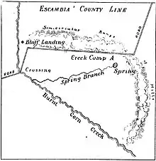 United States soldiers at Fort Mims, having heard of Peter McQueen's mission, sent a quickly organized force, led by Colonel James Caller and Captain Dixon Bailey, to intercept McQueen's party.[4] This force was joined by volunteers from Fort Glass under the command of Samuel Dale.[5] The Americans ambushed the Red Sticks as they bedded down on the evening of July 27, 1813, on the banks of Burnt Corn Creek, in present-day southern Alabama (in what is now northern Escambia County, Alabama).[1] It would become known as "The Battle of Burnt Corn" or the "Battle of Burnt Corn Creek," and would be seen as a part of the broader Creek War.[6]