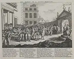 France declared war on Britain and Hanover in March, then invaded the Austrian Netherlands in May.[16] These were significant consequences, allegedly resulting from the failure of the British fleet to win a decisive action against an inferior opponent, [lower-alpha 3] and Parliament demanded a public enquiry. At the subsequent court-martial, seven captains present at the battle were cashiered for failing to do their "utmost" to engage the enemy as required by the Articles of War, another two were acquitted while one died before trial.[lower-alpha 4] [18]