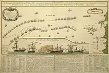 On 21 February 1744, the combined Franco-Spanish fleet of twenty-seven ships of the line and three frigates put to sea with Mathews in pursuit. The British ships were generally larger and more heavily armed than their opponents, carrying over 25% more cannons overall.[9] Both fleets adopted the traditional formation of vanguard, centre and rear, with Navarro and the Spanish ships in front, followed by two French squadrons.[10] On the British side, Mathews led the van, William Rowley the centre and Lestock the rear.[11]
