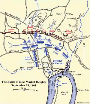 Butler devised a plan that historian John Horn called his "best performance of the war."[9] Rather than repeat the efforts of July and August to turn the Confederate left, Butler planned surprise attacks on the Confederate right and center. His XVIII Corps under Maj. Gen. Edward O. C. Ord, would cross the James River to Aiken's Landing by a newly constructed pontoon bridge. At the original Deep Bottom pontoon bridge, his X Corps under Maj. Gen. David B. Birney would cross, followed by his cavalry under Brig. Gen. August V. Kautz. In a two-pronged attack, the right wing (Birney's X Corps, augmented by a United States Colored Troops division under Brig. Gen. Charles J. Paine from the XVIII Corps) would assault the Confederate lines at New Market Road and drive on to capture the artillery positions behind it on New Market Heights. This action would protect the flank of the left wing (the remainder of Ord's XVIII Corps), which would attack Fort Harrison from the south-east, neutralizing the strongest point of the entire Confederate line. Then, the right wing would assist the left by attacking Fort Gregg and Fort Gilmer, both north of Fort Harrison. Kautz's cavalry would exploit Birney's capture of the New Market Road by driving for Richmond.[10]