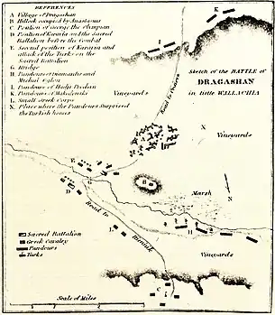 The Ottomans, noticing that the size of the attacking force was less than a half of theirs, returned to their positions and conflicted with the Greeks.[2] Soon the Ottoman greater numbers outweighed the surprising attack of Karavias. The latter retreated, but the Sacred Band did not. The Sacred Band stood and fought the four times larger Ottoman cavalry, even though every hope of victory was lost.[2] Giorgakis Olympios with some men attacked and distracted the Ottomans for a while, saving about a hundred men with their leaders. After this conflict the Wallachian uprising started slowly fall apart.[3]