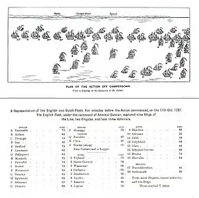 - ↑ William James reports that Admiral De Winter died during his imprisonment in London from a "chronic disease".[64] In fact, De Winter did not die in the aftermath of the battle, and eventually returned to service with the Dutch Navy.