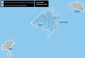 Map depicting the height of the offensive in the Balearics, with Menorca, Ibiza, Formentera, Cabrera, and eastern Majorca all under Republican control (in gray).