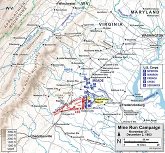 The Battle of Mine Run, also known as Payne's Farm, or New Hope Church, or the Mine Run campaign (November 27 – December 2, 1863), was conducted in Orange County, Virginia, in the American Civil War.
