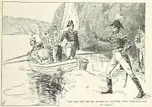 As the light grew, the British guns became more accurate. As a second wave of six American boats began to cross the river, the crews of three of them, including their two largest, one of which was carrying Lieutenant Colonel Chrystie, panicked as they came under fire. Chrystie's pilot turned the boat back for shore, despite Chrystie's efforts to restrain him. This later caused controversy when Captain Lawrence, commanding the next boat following, asserted Chrystie had ordered him to retreat, leading to accusations of cowardice.[27] One of the four remaining boats was sunk by fire from a 3-pound grasshopper cannon and a trio of others, carrying Lieutenant Colonel John Fenwick (formerly the commandant at Fort Niagara) and 80 men, drifted downstream and landed in Hamilton Cove, a hollow about 800 yards downriver, where a detachment of York and Lincoln Militia quickly surrounded Fenwick's men. A blistering fire was opened upon the U.S. infantry; Fenwick was grievously wounded in the face by a pistol shot, also receiving musket balls in his thigh and right side – his cloak was riddled with nine additional balls.[28] Their boats' hulls perforated with musket fire, and most of their comrades killed or wounded within minutes, all the other survivors of Fenwick's party quickly surrendered.[29][25] Three men managed to escape in one boat, which sank on reaching the American side of the river. The last boat drifted within easy range of the gun at Vrooman's Point and its occupants surrendered.