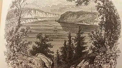 The village of Queenston consisted of a stone barracks and twenty houses each surrounded by gardens and peach orchards.[15] Several farmhouses were scattered through the neighbouring fields and pastures. The village lay at the mouth of the gorge of the River Niagara. Immediately south of the village, the ground rose 300 feet (100 m) to Queenston Heights. The slope from the heights to the river bank was very steep but overgrown with shrubs and trees, making it fairly easy to climb. Lewiston was on the American side of the river, with the ground to its south rising to Lewiston Heights. The river was fast-flowing and 200 yards wide but was described as being little trouble to even an indifferent oarsman.[15] In time of peace, there was a regular boat service between Queenston and Lewiston[20] with permanent landing stages in both villages.