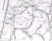 The Seventh and Eighth Armies Ottoman defenders were supplied by two railways which crisscrossed the battlefield. A railway ran from Haifa on the Mediterranean coast to join the main railway from Istanbul to Deraa, which crossed the Jordan River before passing Beisan to enter the Judean Hills at Jenin. There were also good roads from Haifa and Damascus, via Nazareth and Jenin.[8][11] From Deraa the extensive railway network, branched into two lines. The southern line known as the Hejaz railway continued east of the Jordan River to supply the Ottoman Fourth Army headquarters at Amman, the garrisons at Shunet Nimrin and Es Salt and the forces scattered along several hundred miles of the southern Hejaz railway. The western line known as the Palestine Railways crossed the Jordan River at Jisr Majami to become the Jezreel Valley railway, as it ran southwards down the west bank of the Jordan River to Beisan, on the western edge of the Esdraelon Plain. From there it turned westward to run parallel to the front line in the Judean Hills, to Afulah. Here the railway branched again into two lines, one line running north–westerly to Haifa on the Mediterranean coast, while the main line turned south across the Esdraelon Plan to Jenin. From Jenin the railway wound through a narrow pass in the foothills to climb to Messudieh Junction in the Judean Hills where it again branched. One line continued south–eastward to Nablus the Seventh Army headquarters, located on the main road to Jenin, Nazareth and Damascus, while the second line ran westward to Tulkarm and the Eighth Army headquarters before turning south to reach railhead behind the Eighth Army' front line on the coastal plain.[12]