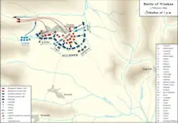 Puchner's right wing and center, using the advantage gained, attacked together the Hungarian center with such force that it soon retreated to its former position, and then was forced to flee also from there after a short time.[14]