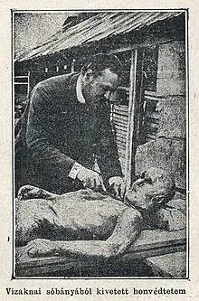 After the battle, both in Vízakna and the following day in Szászsebes, the Austrians and the Romanian troops who fought together with them, massacred the wounded Hungarian soldiers, or those who had survived the battle, and tried to hide in the houses or the salt mines near the town.[3] The majority of the 50 wounded Hungarian soldiers sent from Vízakna to Szászsebes were killed by Saxon insurgents.[3] After the battle, 300 dead and still living wounded soldiers were thrown into the salt mines of Vízakna, from where their bodies, preserved intact by the salt, were removed in 1894.[3] All these killings among the Hungarian soldiers can be considered war crimes. As a result of these atrocities, the number of the Hungarian casualties in Bem's army rose to 569 dead.[3] On 10 August 1896 a marble monument was erected at the salt mine in which the bodies were found, as a homage to the victims of the battle, but in 1920, after the Treaty of Trianon the Romanian authorities newly installed in Transylvania, demolished this monument.[17] Not only the Hungarian soldiers fell victims to the atrocities of the Austrian soldiers and Romanian and Saxon insurgents, but also the Hungarian inhabitants of the city.[18] Puchner allowed 2 hours of free looting for his soldiers among the Hungarians, but the pillaging continued that night too.[19]
