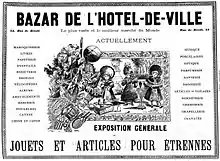 By 1870, Bazar Napoléon occupied all of the stores building on Rue de Rivoli. After the fall of the Second French Empire the store was renamed to "Bazar de l'Hôtel de Ville" referencing Hôtel de Ville across the street.[3][5]