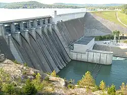 Beaver Dam was authorized by the Flood Control Act of 1944 and other following acts. The United States Army Corps of Engineers constructed Beaver Dam during the years 1960–1966, impounding a major part of the White River and creating Beaver Lake and flooding much of the valley including the remains of the historic resort town Monte Ne. The dam is located 9 miles (14 km) northwest of Eureka Springs, Arkansas. Construction of the powerhouse and switch yard began in 1963. Power generation began in May 1965 and continues today. The initial cost of the project was $60 million. The lake is approximately 50 miles (80 km) in length and covers approximately 31,700 acres (128 km2), with about 483 miles (777 km) of shoreline and an elevation of 1,120 feet (341 m).[2][1] This is also the first dam in the tailwater chain to provide cold water fishery along the White River.[3]
