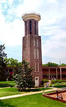 Design of the tower is credited to famed architect Adolphus Heiman with lesser mention of William Strickland. The tower design is based on the Lighthouse at Alexandria, one of the seven wonders of the ancient world, and it is the largest surviving antebellum water tower constructed for private use in the United States. The brick water tower stands 105 feet tall and was originally surrounded by a moat and bridge at the entrance.