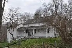 The Benedict House and Shop stand southeast of Ridgefield's town center, on a sloping lot overlooking Rockwell Road to the south. The house is a 1+12-story timber-frame structure, with a gabled roof and off-center chimney. The first floor of the facade is sheltered by a hip-roofed porch with square posts, with small (apparently original) fixed six-pane windows between the porch roof and main roof cornice. Attached to the left side of the house is the workshop, a single-story timber structure with gabled roof, which is set on a high foundation due to the steeply sloping terrain. The interior of the house is a modified center chimney plan, owing to the addition of the third bay during Cass Gilbert's restoration.[2]