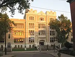 The Bergen Hill Historic District[7] received an opinion of eligibility for New Jersey Register of Historic Places designation (ID#1481) in 1991.[8] It includes Summit Avenue and side streets which feature a mix of late 19th/early 20th architecture that includes brick rowhouses, brownstones, Queen Anne style apartment buildings and private homes. At the foot of avenue is Library Hall, a renovated 1866 building, now residences.[9] It travels north to the landmark St. John's Episcopal Church[10] soon after coming in the neighborhood of the Beacon, site of the former Jersey City Medical Center which since 2005 is being renovated and restored for adaptive reuse. Lincoln High School is on Crescent Avenue which, as its name suggests, arcs the neighborhood as is crosses Communipaw.