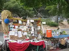 Protester supplies and information near the Berkeley Memorial Stadium oak grove.