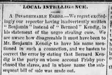 Kendig most likely began in the New Orleans slave-trading business in or before 1839.[5] Between 1852 and 1860 notarial records show that he sold at least 758 people (or about 95 people a year).[3][5] In 1845, "Kendig's auction store" in New Orleans was the site of an attempted murder.[6] A woman named Henrietta Blanchard sought out a "negro trader" named Parker Pettiway at Kendig's and shot him in the gut.[6] When asked the motive, Blanchard replied, "He knows."[6] It is unclear if this Kendig in this report is Bernard Kendig or Benjamin Kendig, another local broker.[3] The two Kendigs sometimes did business together, and they may have been related, although there is no known evidence proving a familial connection.[3] Other characters on the stage may be a third local businessman with the same surname, Henry B. Kendig, and widow Mathilda Kendig Bushy (or Bushey), who was Bernard Kendig's aunt and for whom Kendig testified that he acted as trading agent (and power of attorney), buying slaves with her money and acting at her direction.[7]