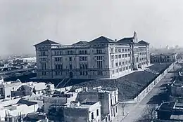 Passed the Argentine Congress in 1918, Law 1420 provided the needed appropriations, and on 26 September 1921, the cornerstone was laid in a ceremony led by President Hipólito Yrigoyen. Designed by local architect Juan Waldrorp, the eclectic, Italianate-influenced building would be the largest school built in Buenos Aires to that point, and measured 140 m (460 ft) in length.[3]