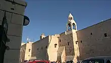Today, the city is surrounded by two bypass roads for Israeli settlers, leaving the inhabitants squeezed between thirty-seven Jewish enclaves, where a quarter of all West Bank settlers, roughly 170,000, live; the gap between the two roads is closed by the 8-metre high Israeli West Bank barrier, which cuts Bethlehem off from its sister city Jerusalem.[72] In 2002 the Church of Nativity was broken into by 200 militiamen who held priests and nuns hostages and plundered the church's coffers, it was subsequently sieged by Israeli forces until a deal was reached.[73][74]