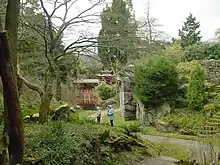 The effective aspect of Biddulph Grange "lies in the way that Cooke and Bateman hid the different areas of the garden from each other, using heaps of rocks and thickly planted shrubberies' the design locks together as tightly as a jigsaw or a cross-section of the brain."[1] It contains "a series of Italianate terraces, connected by steps and enclosing small flower gardens' at the bottom, long, buttressed hedges enclose a dahlia walk,"[1] In the Egyptian part of the garden, "Two sphinxes guard the mastaba-like entrance to a tunnel, whose darkness is an invitation to explore. Deep inside is a bloody chamber (lit by a hidden window of red-coloured glass) in which squats the half-spooky, half-comic figure of the Ape of Thoth."[1]