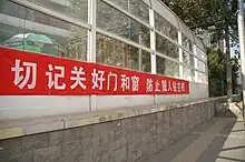 As a form of political expression, big-character posters continue to be used and appropriated. In 2018, as part of the #MeToo movement, students at Peking University used big-character posters to denounce the school administrators' handling of a sexual harassment case.[156] In more recent times, these have been replaced with "Heng Fu" (横幅, lit. 'horizontal scroll') with "Biao Yu" (标语, an inspirational or motivational message or an announcement) inscribed on them.[157] These long, red-colored banners with white or yellow Chinese characters are found all over China in residential complexes as well as in universities and schools.[158][159]