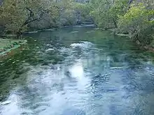 ![]() Big Spring in Missouri is the largest spring in the Ozarks. Pictured here at 240 cu ft/s (6.8 m3/s) experiencing low flow after an extended dry period. | |