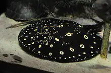 P. henlei reaches up to 71 cm (2.33 ft) in disc width and 104.2 cm (3.42 ft) in total length.[1] It is replaced by the closely related P. rex in the mid and upper Tocantins basin, but that species has concentrically clustered yellow-orange spots.[4] Two other close relatives where the spots are yellowish-white (as in P. henlei) are found in other Brazilian rivers: P. leopoldi from the Xingu River basin and P. albimaculata from the Tapajós River basin.[5] Compared to P. leopoldi, P. henlei is duller above, appearing blackish or dark gray-brown (as opposed to deeper black in P. leopoldi), and its underparts have a large white center and broad brownish-dusky edges (underparts mostly brownish-dusky in P. leopoldi).[5][6] Compared to P. albimaculata, P. henlei has larger yellowish-white spots above.[5][6]