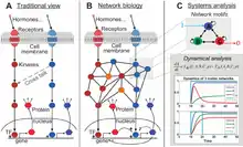 Signals are transduced within cells or in between cells and thus form complex signaling networks which plays a key role in the tissue structure. For instance, the MAPK/ERK pathway is transduced from the cell surface to the cell nucleus by a series of protein-protein interactions, phosphorylation reactions, and other events.[18] Signaling networks typically integrate protein–protein interaction networks, gene regulatory networks, and metabolic networks.[19][20] Single cell sequencing technologies allows the extraction of inter-cellular signaling, an example is NicheNet, which allows to modeling intercellular communication by linking ligands to target genes.[21]