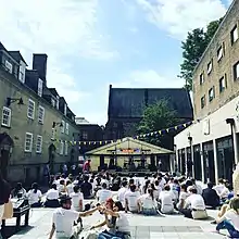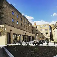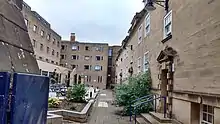 The college commenced the largest building project in its history when it demolished old Jevon's House, a "property of advanced decrepitude" once occupied by the bare-knuckle boxer and politician John Gully before its purchase by the university.[39][40] As parts of the building had become dangerous by this point, the entire structure had to be removed.[40] Construction of the new modernist style Jevons Building, which would complete the new Dunham Court, began in June 1966. It was officially unveiled in a ceremony in June 1968, attended by both Kingsley Dunham and Lord Lieutenant of Durham James Duff.[41] It won a Civic Trust Award the following year.[41] In 1972 a fishpond, since removed, was constructed in the centre of the court at the encouragement of senior college officers.[42]