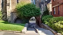 The oldest part of the college site is likely what is now the dining room, believed to date back to the 17th century.[2] It originally formed part of a town house owned by a wealthy member of local society, and was converted in 1760 into a coaching inn, The Red Lion – a stopping point for coaches travelling between London and Edinburgh.[21] During this time it also hosted concerts, probably featuring the work of composers like Charles Avison and John Garth.[33] In 1799 the old coaching inn reverted to being a private residence.[21] In 1845, it was sold to the university, and emerged as the first component of the newly founded Hatfield College the following year.[2] Much more extensive when first occupied by Hatfield, since then "substantial parts of the building" have been replaced by newer structures.[21] Apart from the dining room, what remains are spaces adjoining it that were once used by travellers, but are now filled by the Senior Common Room (SCR) – formerly a card room – the SCR dining room; and finally, on the higher floors, the 'D Stairs' student accommodation block, which comprises 13 twin rooms.[21][34] D Staircase has had a reputation for being haunted by a female spirit, recognisable by the aroma of a distinctive perfume.[35]