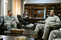 Bismillah Khan Mohammadi (Persian: بسمالله خان محمدی; born 1961, in Panjshir Province), or Bismillah Khan, is an Afghan politician who served as the defense minister of Afghanistan from 2012 to 2015 and for two months in 2021. From 2002 to 2010, he served as Chief of Staff of the Afghan National Army, and from 2010 to 2012 he held the post of Interior Minister of Afghanistan. He has an anti-Taliban background and once served as a senior commander under Ahmad Shah Massoud. Despite the fall of Kabul to the Taliban in August 2021, Mohammadi claims to remain the minister of defense as part of the government of the National Resistance Front of Afghanistan.[1][2][3]