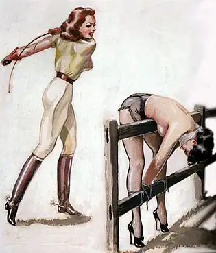 Bizarre magazine began in late 1945, while Coutts was living in Canada.[5] He published the magazine under the pseudonym of "John Willie", a name he kept for the duration of his career. Willie was introduced to the American fetish underground by Charles Guyette and later worked with Irving Klaw, the infamous BDSM merchandiser later charged with obscenity, but he is best known for his fetish cartoon character Sweet Gwendoline, which he drew in a style that influenced later artists such as Gene Bilbrew and Eric Stanton. Other characters include U69 (censored to U89 in some editions), the raven-haired dominatrix who ties up Gwendoline and Sir Dystic d'Arcy, the only prominent male character and probably a parody of Willie himself.[6] Sweet Gwendoline was published as a serial in Robert Harrison's mainstream girlie magazine Wink from June 1947 to February 1950 and later in several other magazines over the years.