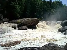 Great Conglomerate Falls is the southernmost (the Black River flows north) of the more publicized falls and the first large waterfall on the river's approach to Lake Superior. The river drops 30 feet (9.1 m) around a large piece of conglomerate rock, boulders and tree trunks into a deep gorge. Potawatomi Falls drops nearly 40 feet (12 m) in two sections around a piece of conglomerate rock, similar to Great Conglomerate Falls.