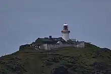 The lighthouse on Blackrock Island was constructed in 1864.[10][11] The tower was built of stone quarried from the rock on which it stands; the keepers' dwelling is contiguous.[12] It is a 50-foot-high round stone tower with lantern and gallery attached to a single storey keeper's house. The lighthouse is painted white. It is one of Ireland's most remote lighthouses and the most westerly lighthouse off the Mayo Coast. Keepers and their families lived on the rock for 29 years, until dwellings were built at Blacksod, on the mainland, and the station made relieving, in 1893.[12]
