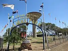 Frank Tutungi Memorial Lions Park is on the corner of the Capricorn Highway and Mackenzie Street. It is named after one of the Blackwater Lions Charter Members, Frank Tutungi, who was one of the original members of the Blackwater Lions Club and was the first from Blackwater to become a District Governor. The park displays the flags of the 37 nationalities who have lived and worked in the town.[60]