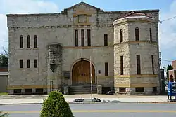 Blairsville Armory is a historic National Guard armory located at Blairsville, Indiana County, Pennsylvania. It was designed by Pittsburgh architects W.G. Wilkins & Co. It was built in 1909, and is a T-shaped, two-story, three-bay-wide and nine-bay-deep, castle-like building in the Romanesque Revival style. The front section is the flat-roofed administration building, with a gable roofed drill hall behind. It front facade features a central arched entrance with a five-sided, two-story bay window on the right side.[2]