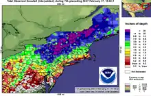 - ↑ NOAA (2007-02-14). "Snowfall totals from the February 13–14, 2007 winter storm". Retrieved 2007-02-15.