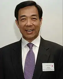 In 2001, a corruption scandal involving former Liaoning governor Zhang Guoguang provided an opportunity for Bo's advancement.[12] Prior to the 15th Party Congress, Bo Yibo and Bo Xilai assisted then-party general secretary Jiang Zemin in preparing to force political rival Qiao Shi into retirement. The Bo family also supported Jiang's "Three Stresses" (San Jiang) campaign in 1997, which was intended to strengthen ideological conviction and promote internal unity in the Communist Party; however, the campaign was generally seen as lacklustre by observers and not universally embraced even inside the party leadership.[8] The Bos' unwavering support for Jiang was said to have worked in Bo Xilai's favour when the vacancy for Governor of Liaoning opened. Bo became acting governor in 2001 after the dismissal and arrest of Zhang Guoguang,[8] and was officially confirmed as governor in 2003.[9] In his position as governor, which he held until 2004, Bo gained membership to the Central Committee of the Communist Party.[4]