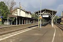 The station was opened on 1 March 1871 and has three platform tracks and several sidings. Somewhat hidden from the station building, there are some tracks which are used by the Rhein-Sieg-Eisenbahn for special passenger services, especially during the Pützchen's market (a five or six day fair usually held in September). In addition, there is also a freight shed at the station. It, including its unloading and loading roads, as well as the entrance building, the two platforms and the platform canopy are heritage-listed.[5]